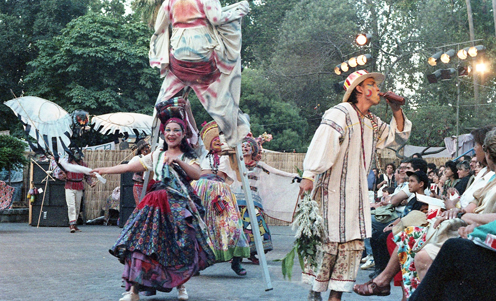 1992 – POPOL VUH, primera parte: la creación | Dirección general: Andrés Pérez Araya. Actores: Rosa Ramírez Ríos, Roxana Campos, Ximena Rivas, Viviana Veas, Ramón Llao, Manuel Peña, Ignacio Mancilla, Jaime Mc Manus, Ignacio Miranda, Gonzalo Muñoz, René Rossel, Marcos Grez, José Gutiérrez. Músicos: Javiera Parra, Cuti Aste, Emmanuel Becerra, Marco Garrido, Martín Oyarzún. Diseñadores: Alma Martinoya, Maite Lobos, Queno Delgado, Luis Reinoso. Sonido: Felipe Zabala. Técnico: Mauricio González, Pancho Ochoa. Colaboradores: Guillermo Olivares, Pablo Llao, Fernando Meneses, Ana Peña, Víctor Parra. Producción: María Teresa Bravo, Cía. Gran Circo Teatro