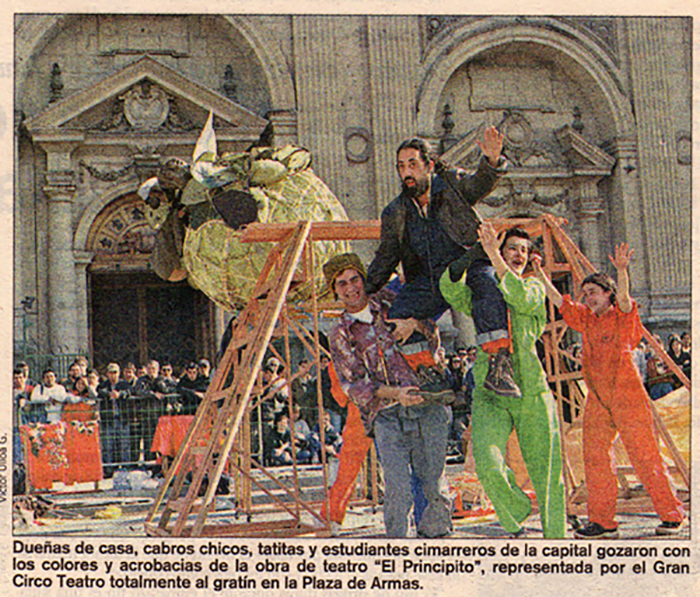 2000 – VISITANDO EL PRINCIPITO | Dirección de Andrés Pérez Araya. Teatro de calle, estrenado en la Plaza de Armas de la Comuna de Santiago, Rosa Ramírez Ríos, Mariana Muñoz, Gala Fernández, María Soledad Yánez, Fernando Gómez-Rovira, Ivo Herrera, Ernesto Anacona, Györdy Cerda, Juan José Olavarrieta. Jefe Tecnico: Mauricio Gonzalez.