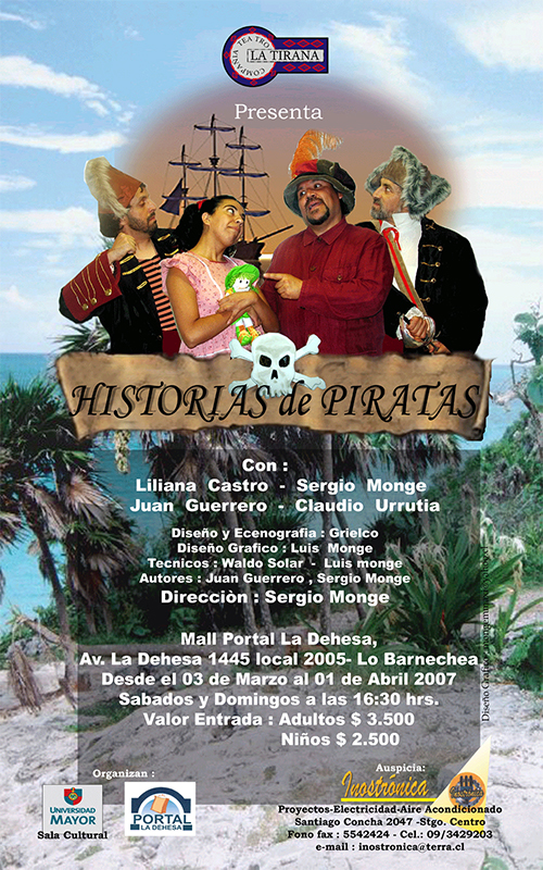 2009 – HISTORIAS DE PIRATAS | Estreno, sala Teatro Mall la Dehesa, Sala Galpón 7 | Dirección Sergio Monge, Elenco Juan Guerrero, Lili Castro, Claudio Urrutia, Sergio Monge, Producción Teatro La Tirana, Dramaturgia Juan Guerrero y Sergio Monge, Técnica y diseños gráficos Luis Monge, Diseños integrales Grielco.