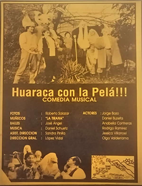1991 – HUARACA CON LA PELA | Comedia musical estrenada en el cine Acapulco Paradero 22 de calle Santa Rosa, Santiago. Este montaje participó en el: 3º Encuentro de teatro Latinoamericano – Santa Fe – ARGENTINA. | Jorge López Vidal, director. Sandra Pinilla (Asistente). Actúan: Jorge Bozo, Olga Valderrama Jessica Villarroel Alicia Rodrigo Ramírez y Daniel Buzeta.