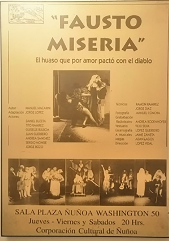 1996 – FAUSTO MISERIA | Estreno sala Plaza Ñuñoa. | Dirección Jorge López Vidal, Dramaturgia Manuel Macarini Elenco: Jorge Bozo, Andrea Araya, Gisel Bulboa, Rodrigo Ramírez, Daniel Buzeta, Juan guerrero, Sergio Monge, Técnica Ramón Ramírez y Luis Díaz, Iluminación Dagoberto Siva, Vestuario Vicky Silva, Música Andreas Bodenhöfer, Efectos de magia Adán Lagos. Gira por San Fernando Buenos Aires, Santa Fe, Argentina.
