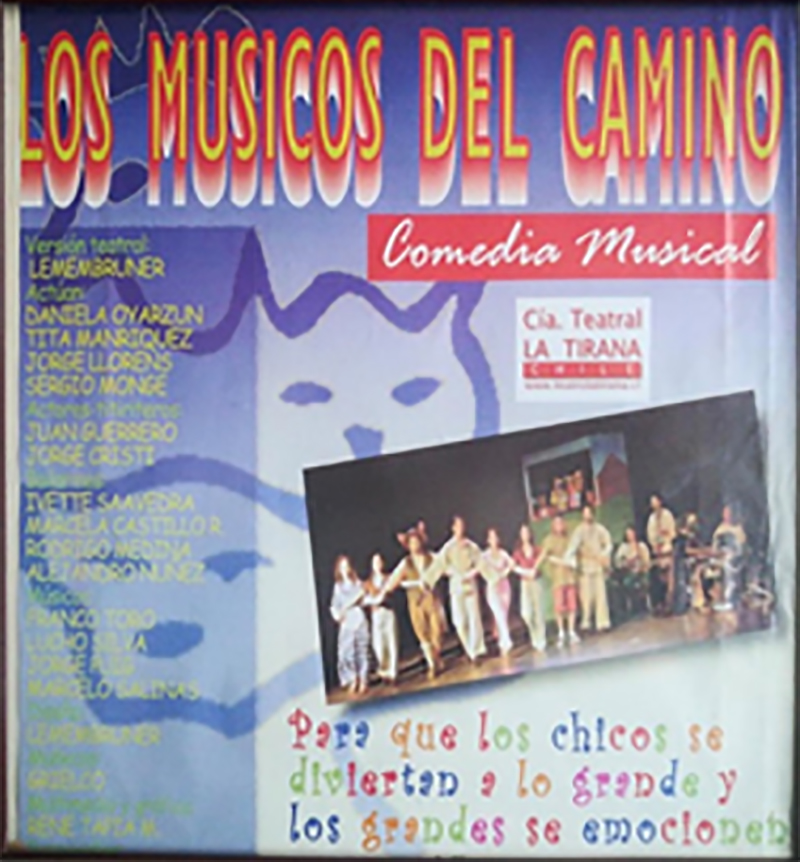 2000 – LOS MÚSICOS DEL CAMINO | Dirección Jorge López Vidal, Elenco de actores Tita Manríquez, Jorge Llorens, Jorge Cristi, Sergio Monge, Daniela Oyarzun, Juan Guerrero, Bailarines Alejandro Nuñez, Marcela Castillo, Ivette Saavedra, Rodrigo Medina , Músicos, Luis Silva, Franco Toro, Luis Puig, Marcelo Salinas, Muñecos Grielco, Asistencia de Dirección Lili Castro.