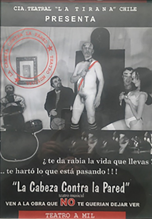 2001 – LA CABEZA CONTRA LA PARED | Estreno sala Galpón 7 Temporada Sala Galpón 7 y Teatro Mauri Valparaíso | Dirección Jorge López Vidal, Elenco Marcia del Canto, Luis Silva, Juan Guerrero, Jorge Cristi, Sergio Monge, Producción Arheli García Huidobro, Dramaturgismo Teatro La Tirana.
