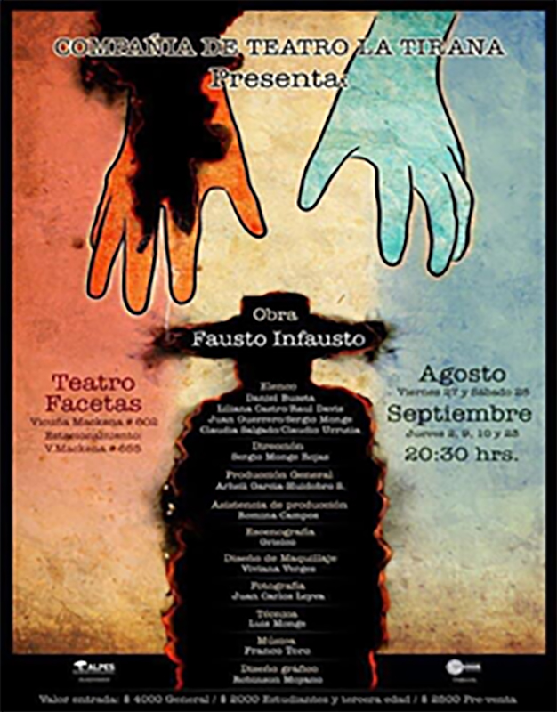 2010 – FAUSTO-INFAUSTO | Versión renovada | Dirección Sergio Monge Rojas Elenco Lili Castro, Claudia Salgado, Juan Guerrero, Claudio Urrutia, Raúl Davis, Daniel Buzeta, Sergio Monge, Producción General Arheli García Huidobro, Técnica Luis Monge, Música Franco Toro, Diseño de Maquillaje Viviana Verges, Asistencia de Producción Romina Campos, Diseños Robinson Moyano, Fotografía Juan Carlos Leyva, Escenografía Grielco.