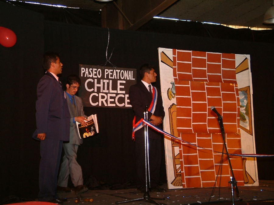 2002 – “CHILE CRECE” | Una parodia del sistema político actual, llevando a escena el mal uso de ésta por parte de los políticos hacia los destinatarios (pobladores), develando la desmesurada irresponsabilidad con la cual el gobierno juega con los sueños y esperanzas de los pobladores. | DE MARCOS OLIVOS Dirige: Pasmi Actúan: Cía Fénix, CCP Colina 1.